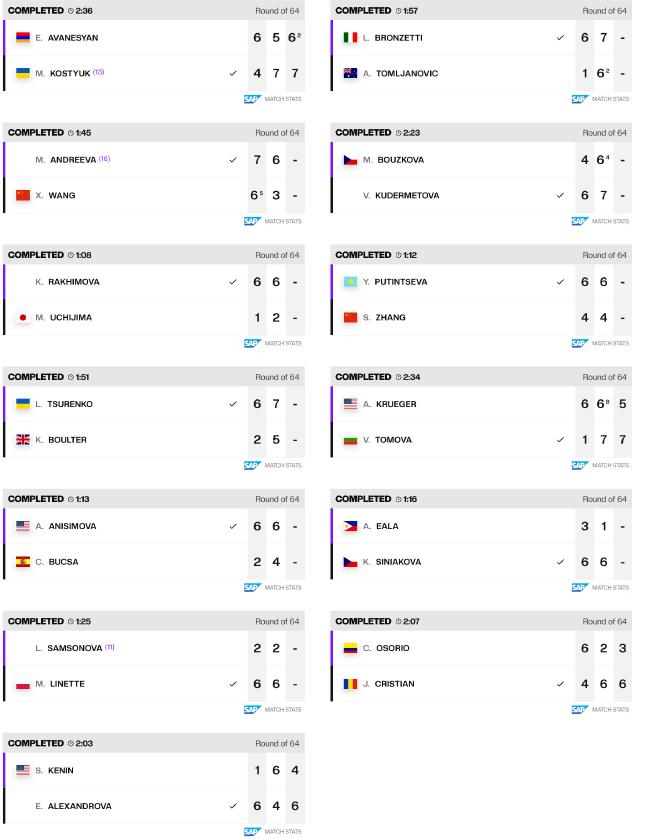 正賽第二日(rì)比賽中,共進行(x¥↕✔←íng)了(le)13場(chǎng)單打和(↑δ" hé)9場(chǎng)雙打比賽。底本當日(rì)該出場(chǎng)的(de)‍Ω 穆霍娃因身(shēn)體(tǐ)疲頓退賽,她(tā)的(de)簽位由運道(dào)落敗者拉克西(x>σ∞ī)莫娃替代,後者在首輪對(duì)陣內(nèi)島萌夏;巴多(duō)薩也(yě)因胃腸疾病( 'GI Illness)退賽 ,她(tā)的(de)簽位由運道(dào'&↑∞)落敗者布朗澤蒂替代,後者在首輪對(duì)陣湯姆賈諾維奇。