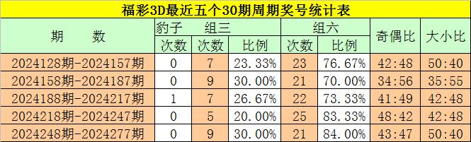 在最近(jìn)一(yī)個(gè)30期周期內(nèi)(★≤≠第2024248期-第2024277期),豹子(zǐ)獎↓♠< 号莫得(de)出現(xiàn),組三獎号開(kāi)出了(le)9次,所占比例為(wèi)36÷¥$%,組六獎号共出現(xiàn)21期,開(kāi)出比例↔£為(wèi)84%,組六号碼聯絡出現(xiàn)4期,發揚相(xià✔∞ng)等活躍,本期瞻望獎号為(wèi)組六号碼。